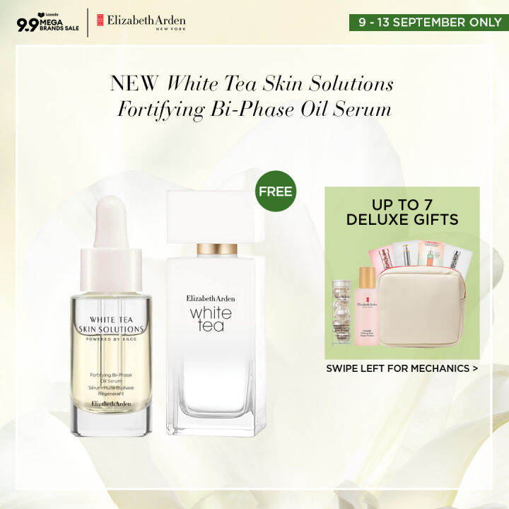 Elizabeth Arden White Tea Skin Solutions Fortifying BiPhase Oil Serum Elizabeth Arden White Tea Skin Solution Serum Explore our new skincare line, white tea skin solutions. Explore our new skin care line, white tea skin solutions. It’s one of nature’s potent antioxidants and the most active antioxidant molecule from the tips of the precious white tea leaf. Their bioengineered egcg reinforces natural collagen in as little as six hours, delivers 3x the antioxidant power, strengthens skin's power. Elizabeth Arden White Tea Skin Solution Serum.