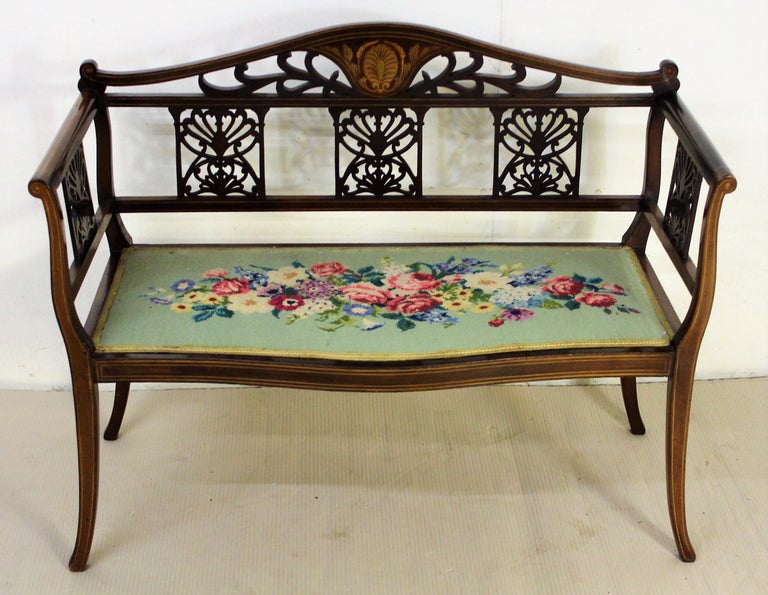 English Edwardian Period Inlaid Mahogany Settee or Bench For Sale at