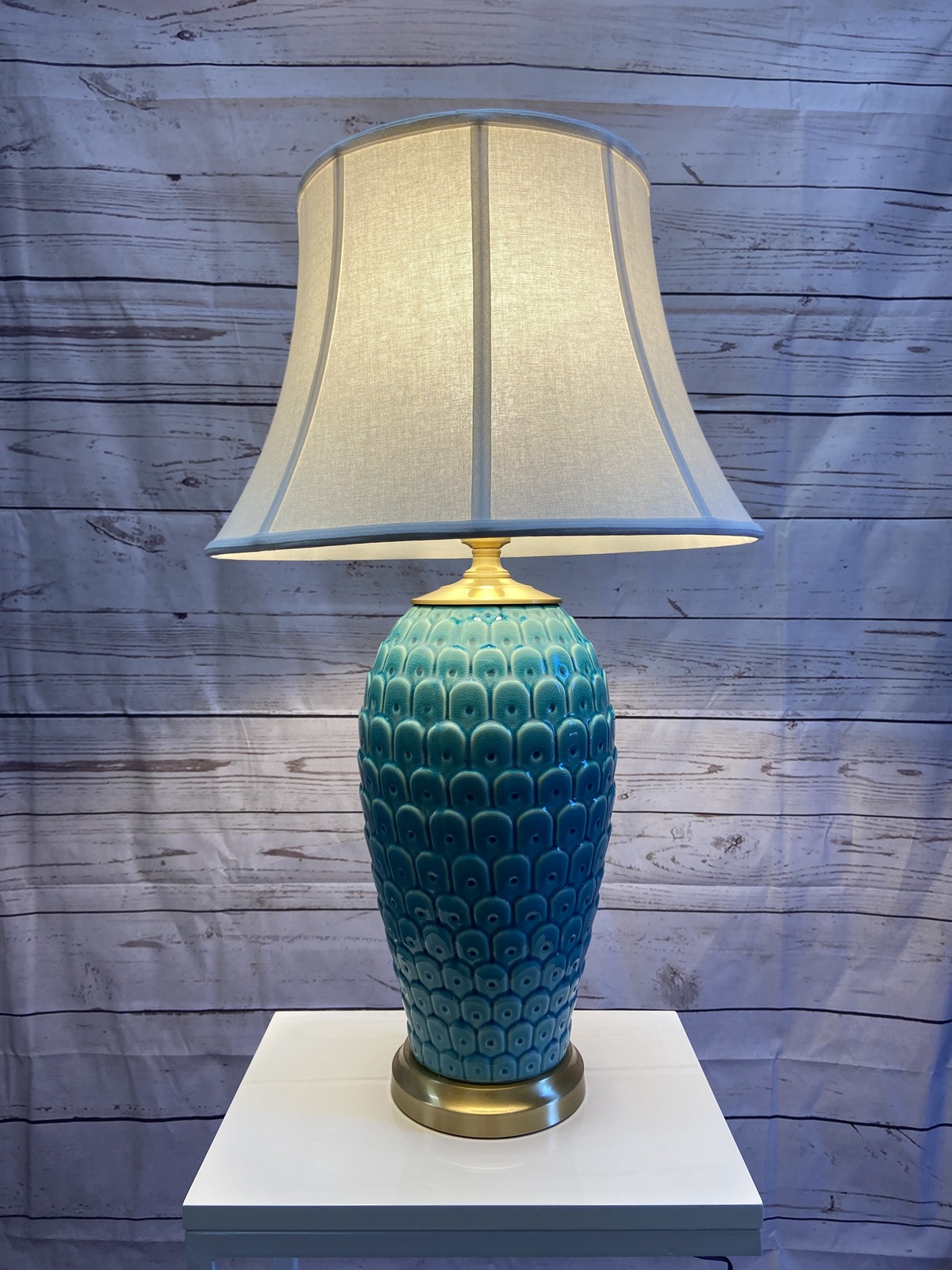 Turquoise ceramic table lamp with white fabric shade Lamps