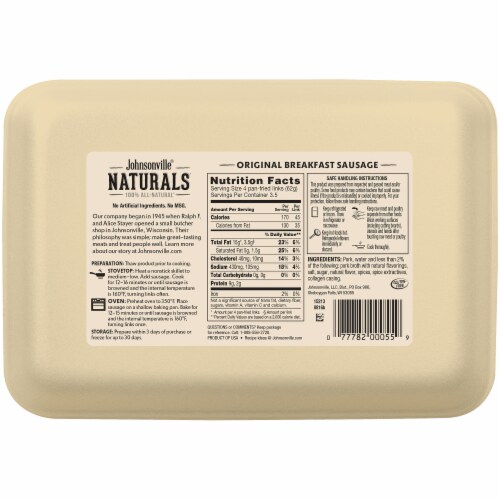 Johnsonville Sausages Nutritional Information . There are 260 calories in johnsonville sausage, l.l.c. Get nutrition information for johnsonville items and over 200,000 other foods (including over 3,500 brands). Always refer to the package label for the most current ingredient and nutritional information. Johnsonville’s original breakfast sausages combine the great flavour of juicy pork sausage with a balanced rosemary and sage seasoning. Pork, water and less than 2% of the. 75% fat, 2% carbs, 22% protein. There are 180 calories in 2 oz (56 g) of johnsonville original summer sausage. 2 oz (56g) serving per container: Made with only premium cuts of pork and a.