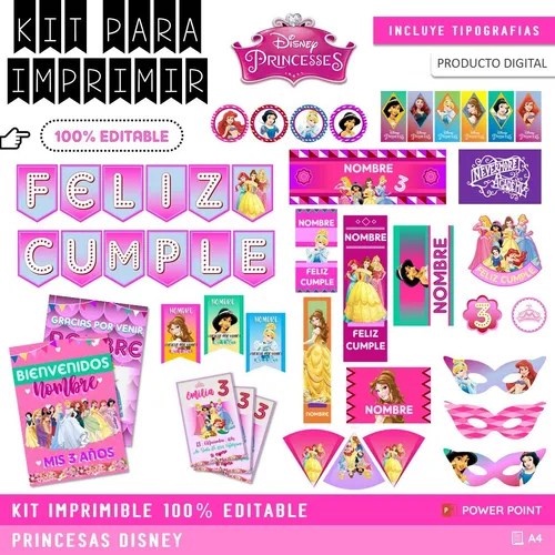 Kit Imprimible Cumpleaños + Candy Editable Princesas en venta en