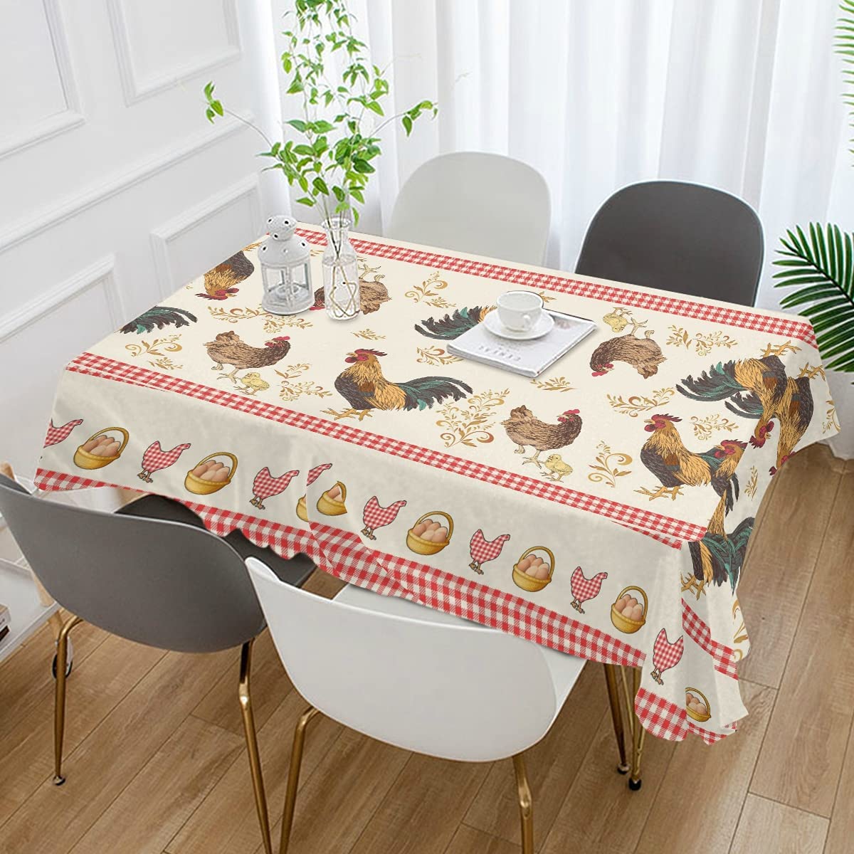 Vintage Rooster Tablecloth Red Plaid Waterproof Stain Resistant