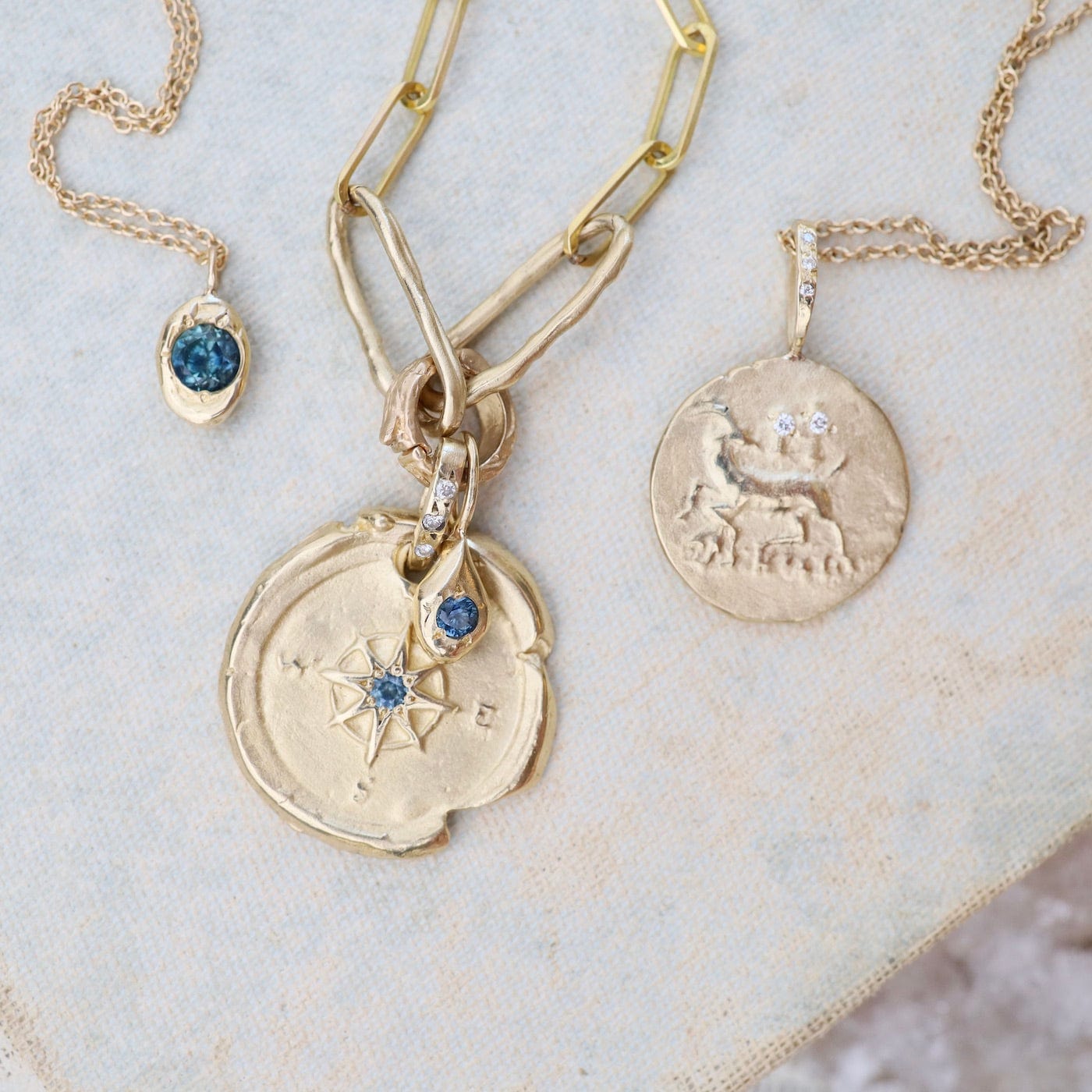 14k Yellow Gold Compass & Paperclip Necklace with Montana Sapphire