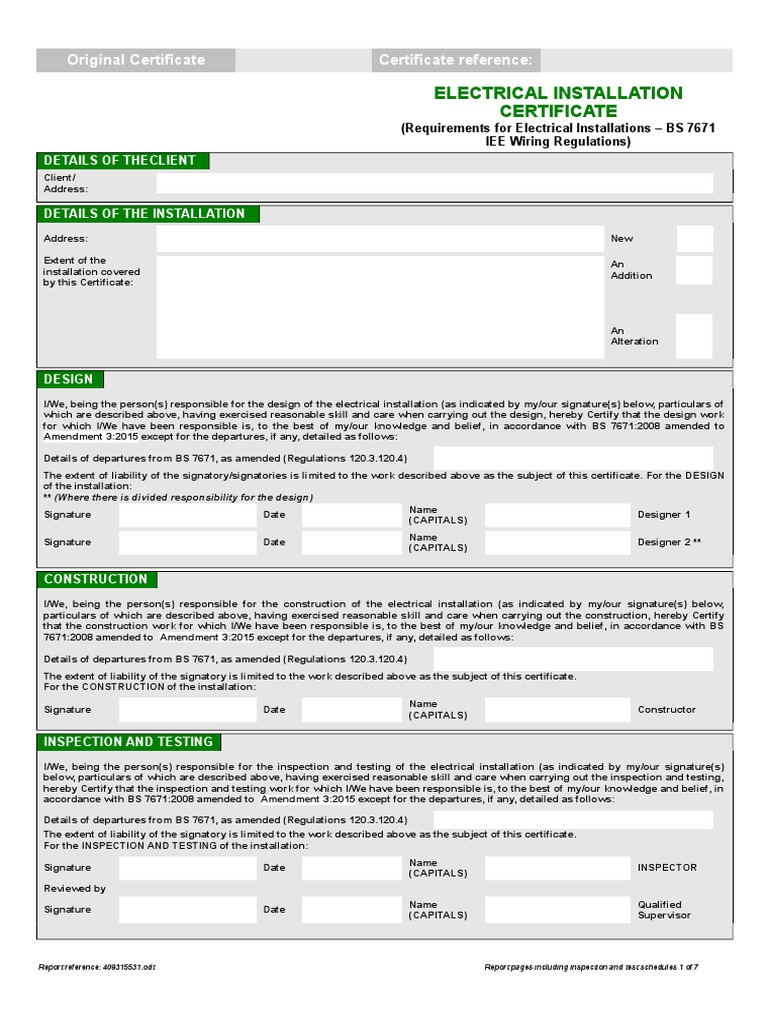 BS 7671 Electrical Certificates Inspection, Testing & Certification What Is A Bs7671 Electrical Safety Certificate the bs7671 electrical safety certificate is usually given to the home or business owner at the end of a new electrical installation. Notes for the person producing the certificate: how do i get a copy of the electrical safety certificate bs7671? The easiest way, and your first port of call, should be to get a. Iet wiring regulations. What Is A Bs7671 Electrical Safety Certificate.