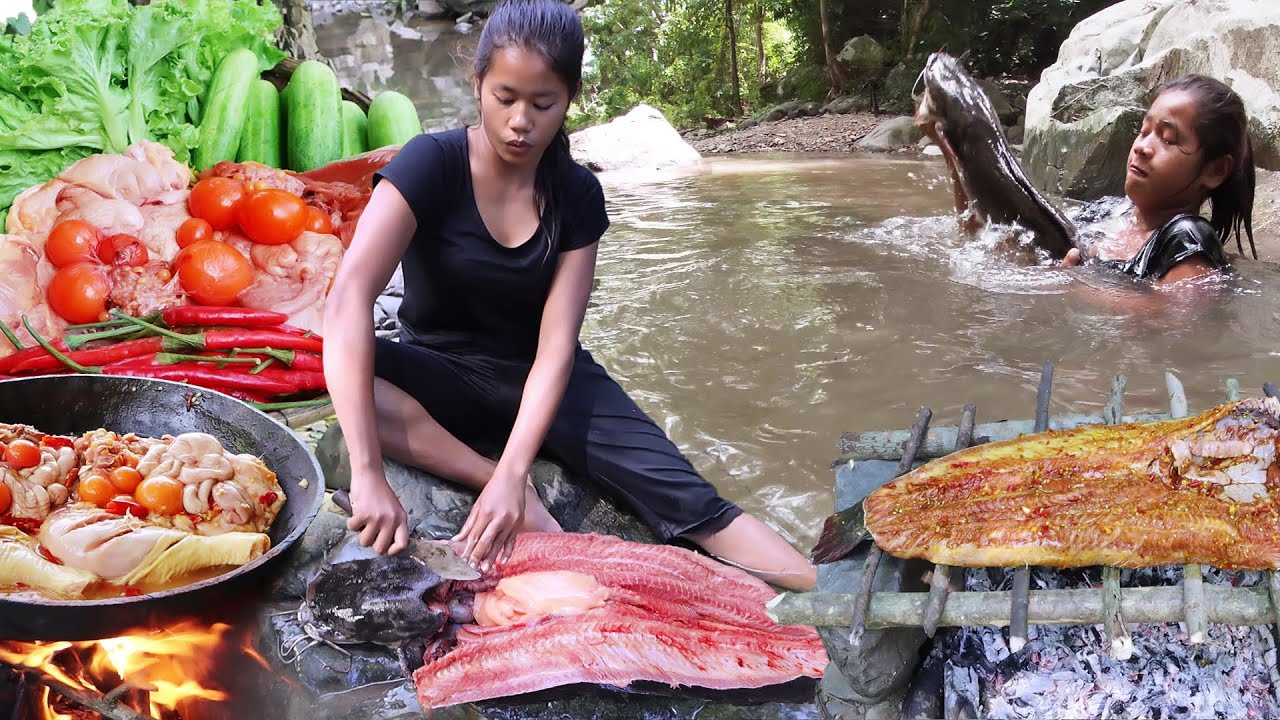 Catch big catfish in river, Catfish spicy chili roast for dinner and Chicken soup tasty, Top 8