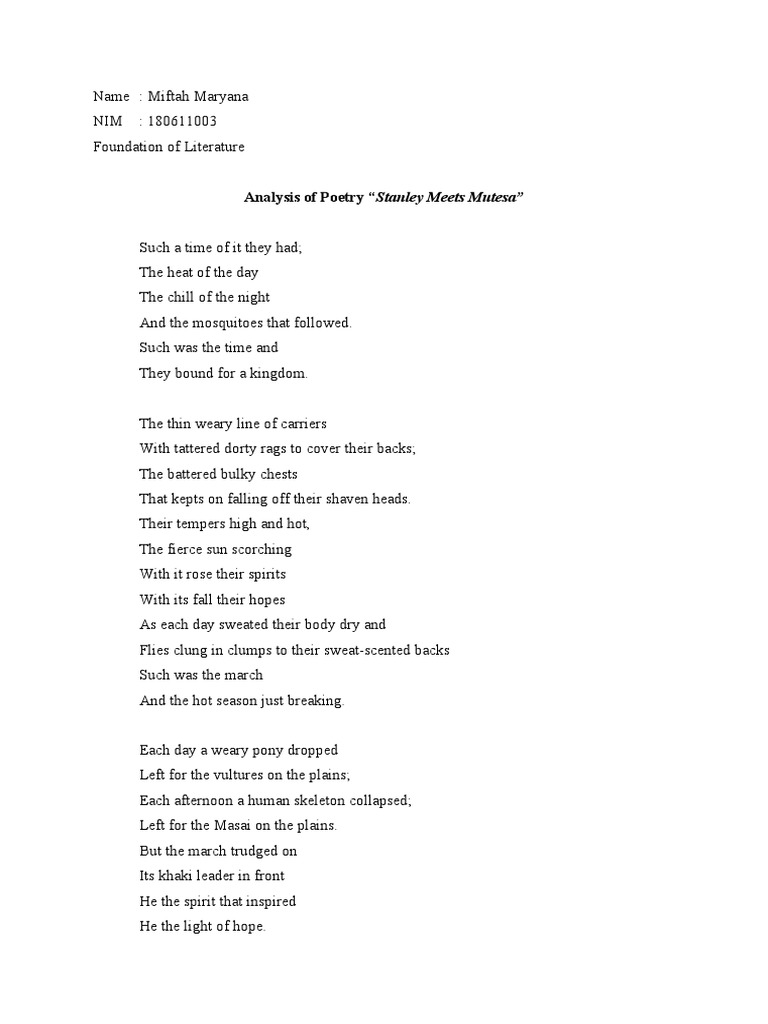 Types of Poetry II Descriptive Poetry, Narrative Poetry, Dramatic Stanley Meets Mutesa Analysis The meeting of these two symbolises the meeting. The chapter engages the theory of phenomenology with issues of migration, construction and contestation of identity, and the question of history in selected. “stanley meets mutesa” narrates the journey of henry stanley (born john rowlands), one of the british explorers who worked for the colonization of some african countries and their annexation. Stanley Meets Mutesa Analysis.