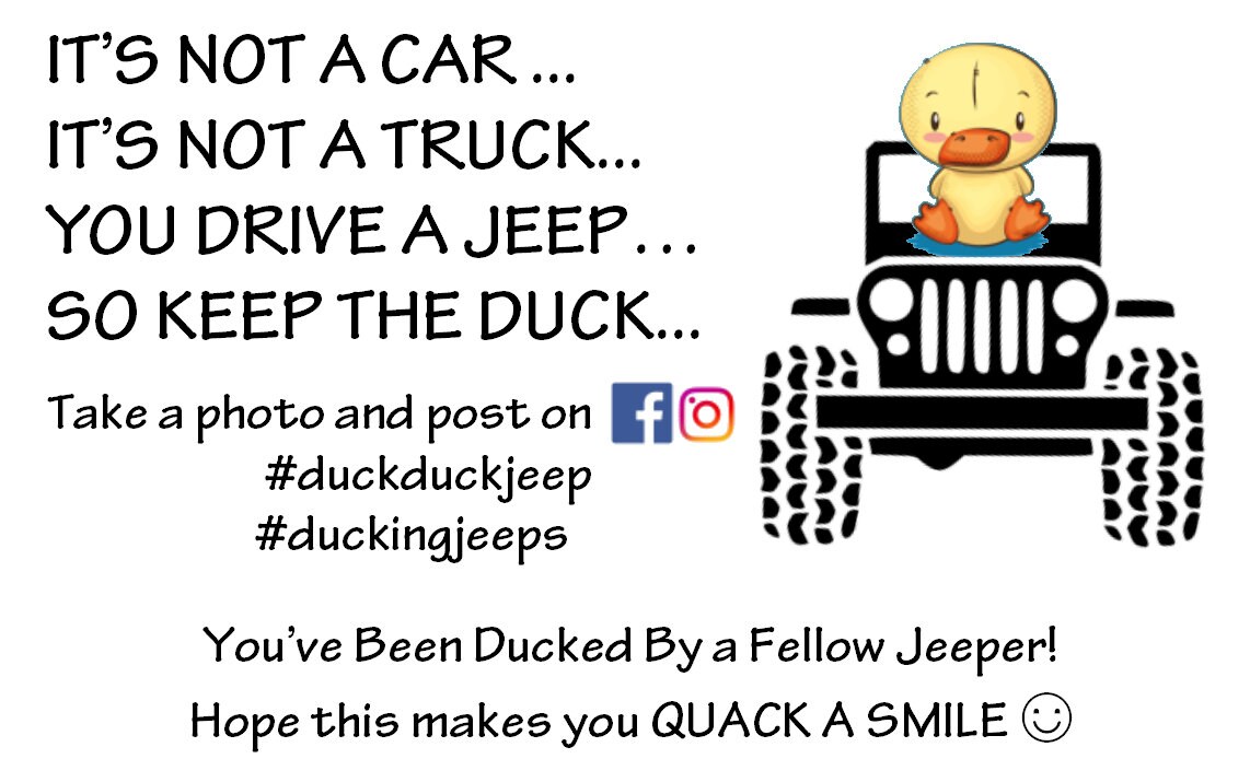 Duck Duck Jeep Cards In order to help you out, in participating with the duck duck jeep trend, i have created a free printable for you, with duck duck deep tags. Check out our personalized duck duck jeep cards selection for the very best in unique or custom, handmade pieces from our car accessories. Buy any 10 and get 30% off. Buy any 50. Duck Duck Jeep Cards.