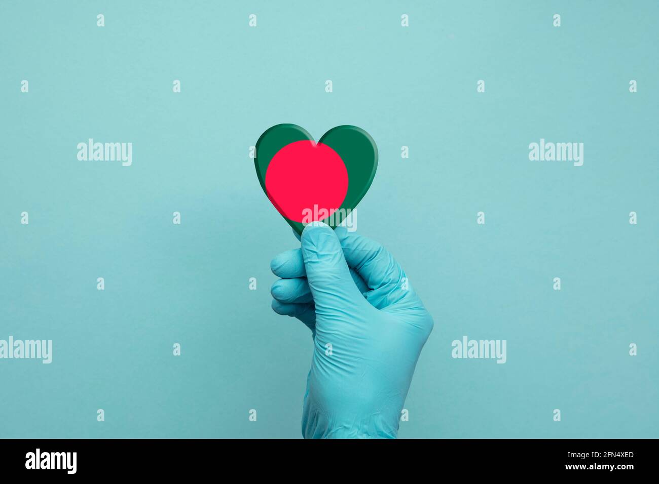 Hands wearing protective surgical gloves holding Bangladesh flag heart