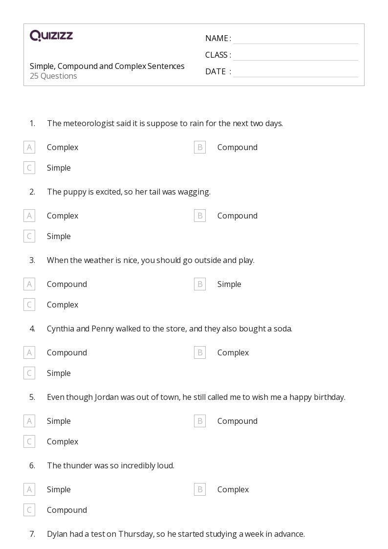 50+ Simple, Compound, and Complex Sentences worksheets for 7th Class on Quizizz Free & Printable
