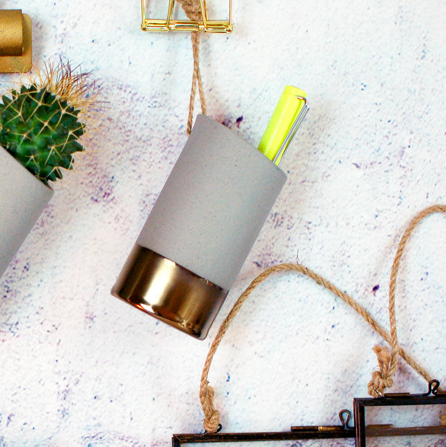 concrete gold brass hanging pen holder desk tidy by made with love