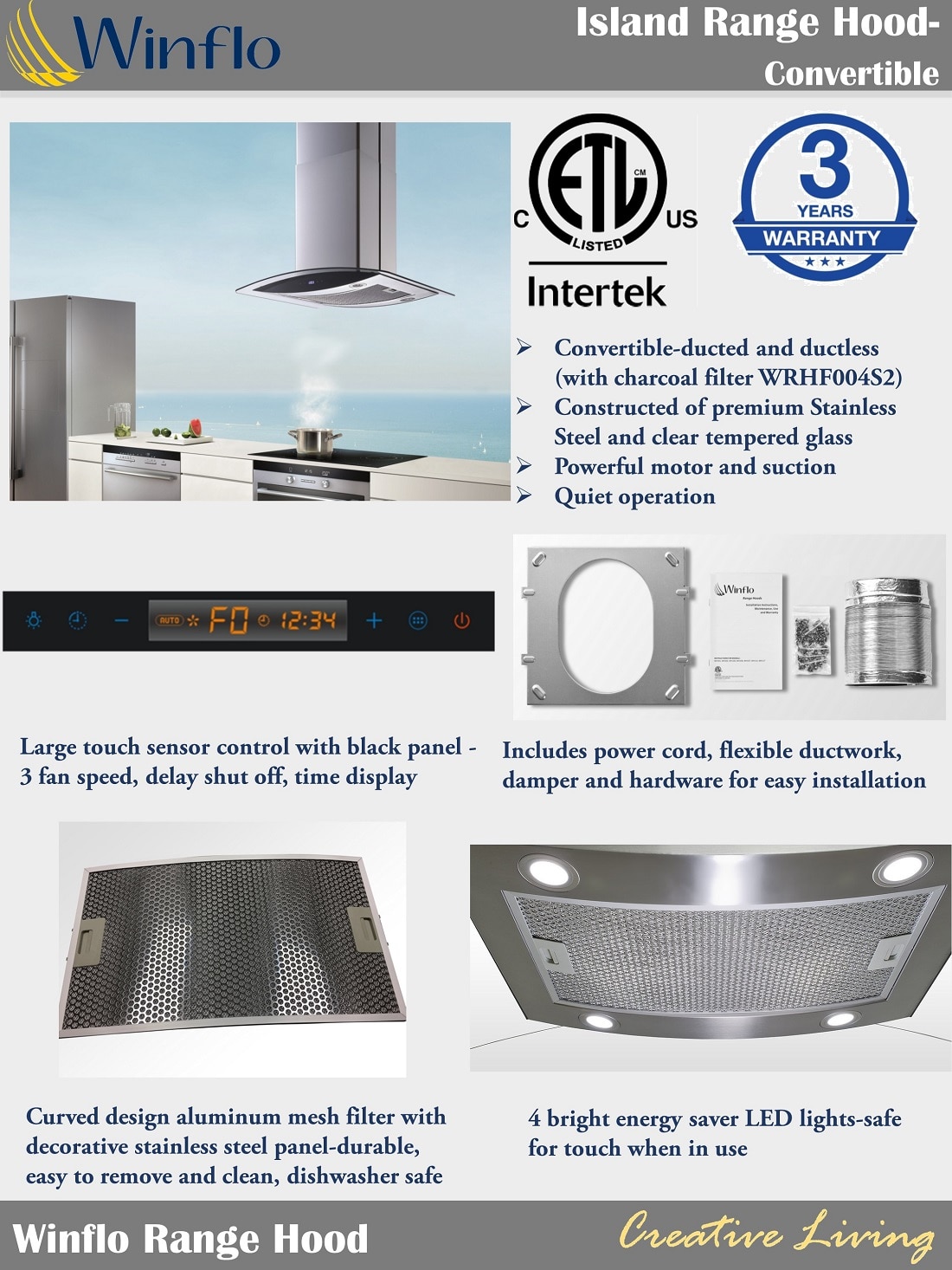 Winflo Convertible Island Range Hood, Stainless Steel, 36 Winflo Convertible Range Hood Installation Wall mounted range hood is constructed of premium 430 brushed stainless steel and clear tempered glass. 2 bright energy saver led lights illuminate your cooking area and a push button panel. Constructed of premium stainless steel ; Installing the range hood this installation is for mounting the product to a wall. It is the installer's responsibility to comply with installation. Winflo Convertible Range Hood Installation.