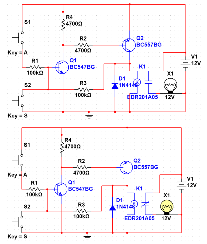 2 NPN PNP BJT Transistor Latch Circuit Design Proteus Simulation Transistor Latch Circuit With Reset — the video shows how to make a simple yet effective relay latching circuit using just a couple of transistors. — 5 working explanation. In other words, it locks its output when it receives a. — what is a transistor latch? A latch circuit is a circuit that locks its output when an input trigger signal is. Transistor Latch Circuit With Reset.