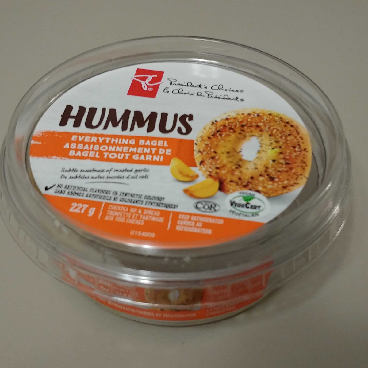 Everything Bagel Hummus President's Choice 227 g President S Choice Hummus Ingredients Pc spicy hummus chickpea dip & spread. Chickpeas, water, tahini (sesame seed paste), canola oil,onion, balsamic vinegar (contains grape must), concentrated lemon. Enjoy with assorted fresh dippers like red peppers, cucumbers and carrots, or use it to spice up everyday turkey and roast beef sandwiches. Pc roasted pepper & paprika hummus chickpea dip and spread. Chickpea, water, canola oil, tahini. President S Choice Hummus Ingredients.