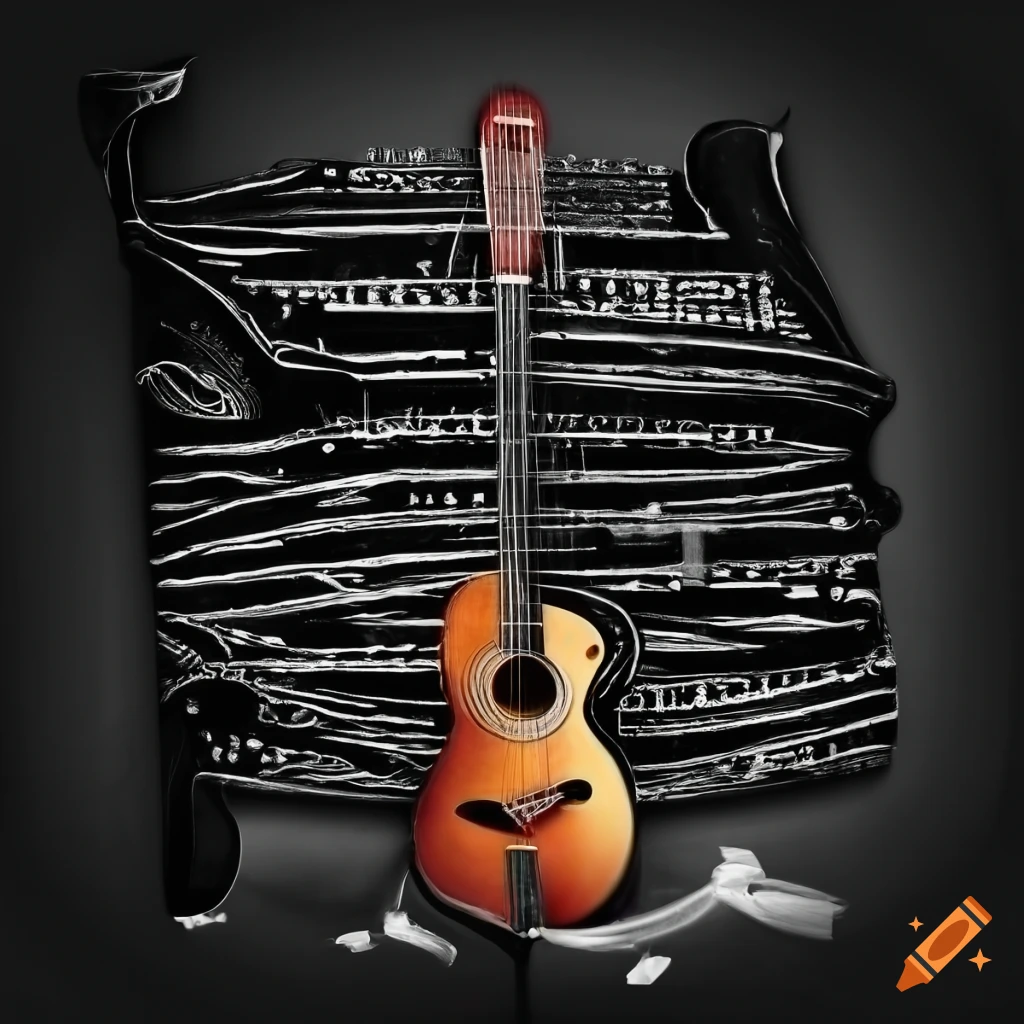 Black and white image of a guitar and song lyrics