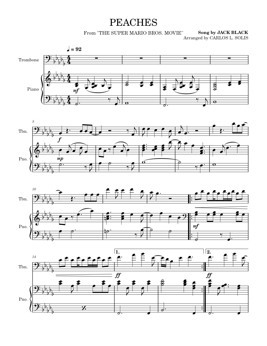 Movie) sheet music for trombone solo by jack black from sheet music direct. Download and print peaches (arr. 45 plays / 215 views. Jack black, michael jelenic, aaron horvath, john spiker, eric osmond. From super mario bros movie. Uploaded on apr 26, 2024. Márcio silva) sheet music for trombone solo by jack black from sheet music direct. Download and print peaches (from the super mario bros.