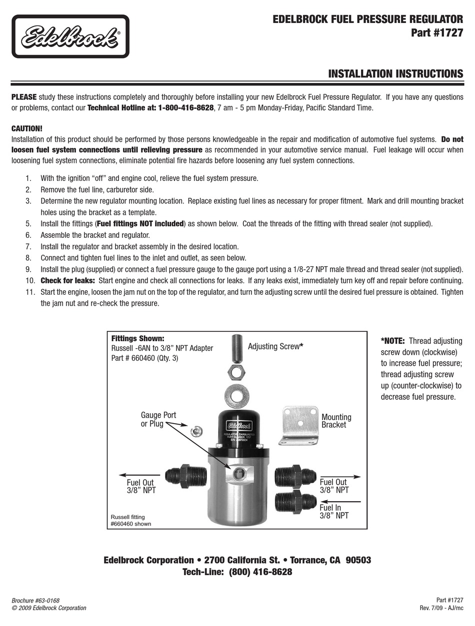 EDELBROCK 1727 INSTALLATION INSTRUCTIONS Pdf Download ManualsLib Edelbrock 1727 Fuel Pressure Regulator When i observe the fuel pressure, it drops from 58 until i take my foot out of it to avoid engine damage. Edelbrock fuel system components covers a wide range of products for your fuel management needs, from injectors, complete fuel line kits to. This edelbrock fuel pressure regulator number 1727 is compatible with all grades of gasoline, ethanol, methanol. Edelbrock 1727 Fuel Pressure Regulator.