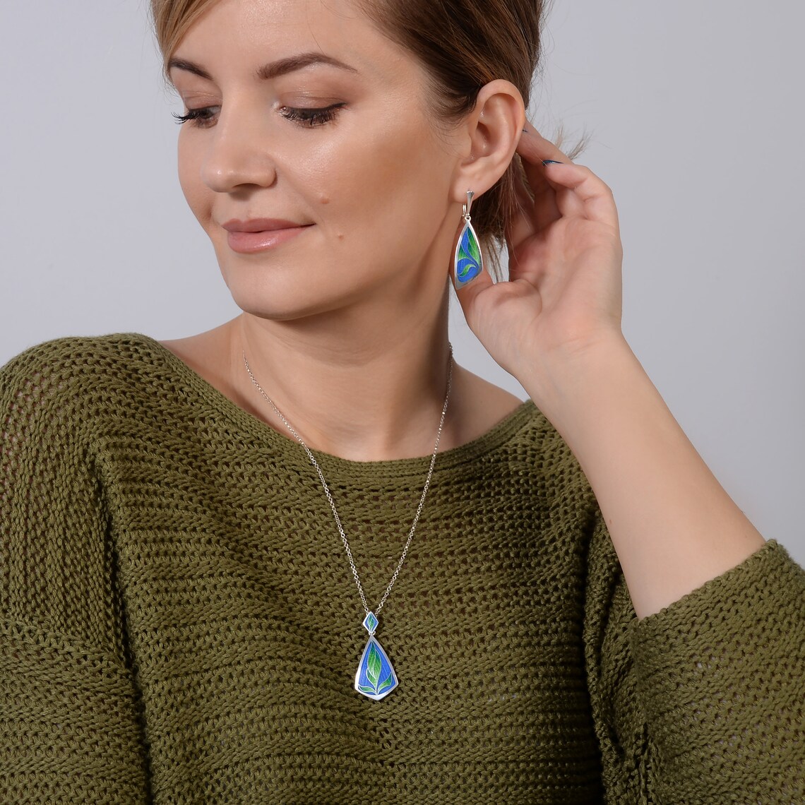 Greenery Enamel Jewelry Set Cloisonne Enamel Sterling Silver Etsy