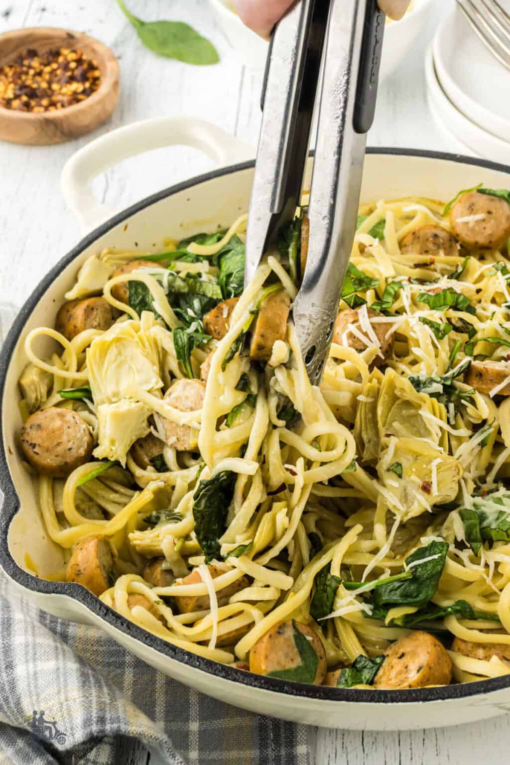 OnePot Spinach Artichoke Pasta With Chicken Sausage