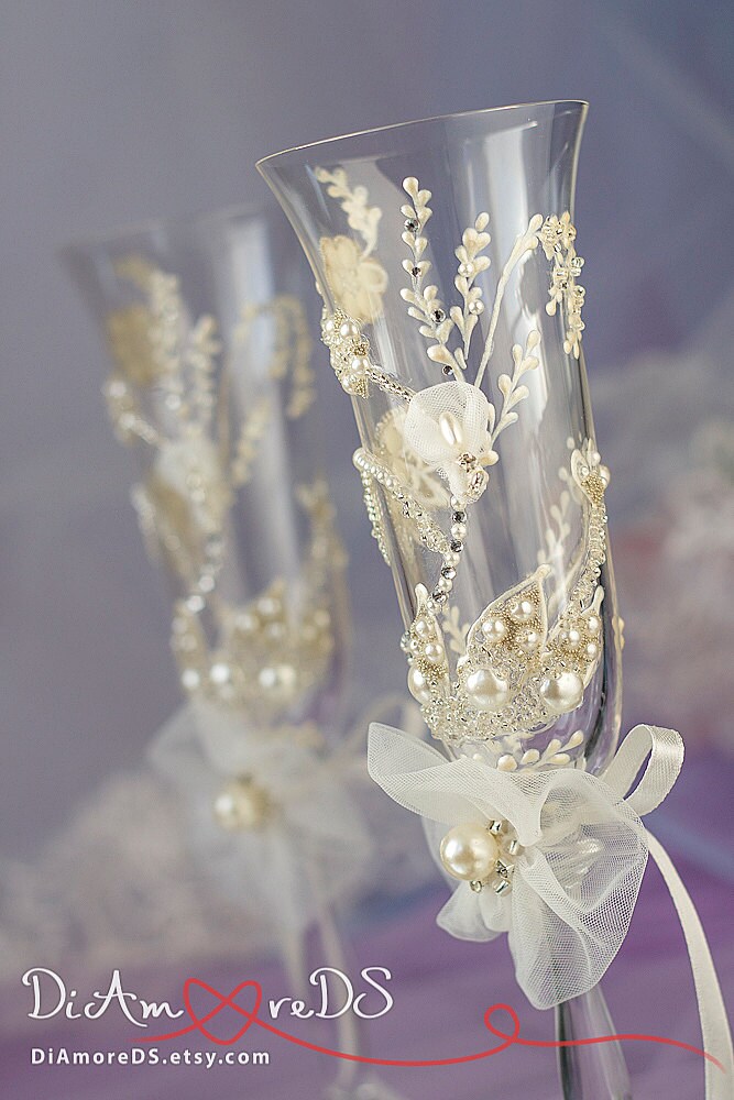 Rhinestone wedding champagne flutes pearl wedding by DiAmoreDS