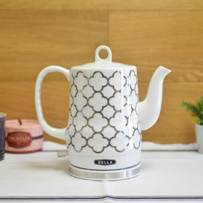 BELLA (14102) 1.2 Liter Electric Ceramic Tea Kettle with Detachable Bella Electric Ceramic Teapot Bella electric kettle and tea pot, ceramic water heater with detachable swivel base, auto shut off and boil dry protection, 1.5 liter, blue aztec. Enjoy peace of mind in every sip with the bella electric ceramic coffee and tea kettle. Boil water for your tea and coffee in style with the bella electric ceramic kettle. Bella electric kettle & tea. Bella Electric Ceramic Teapot.