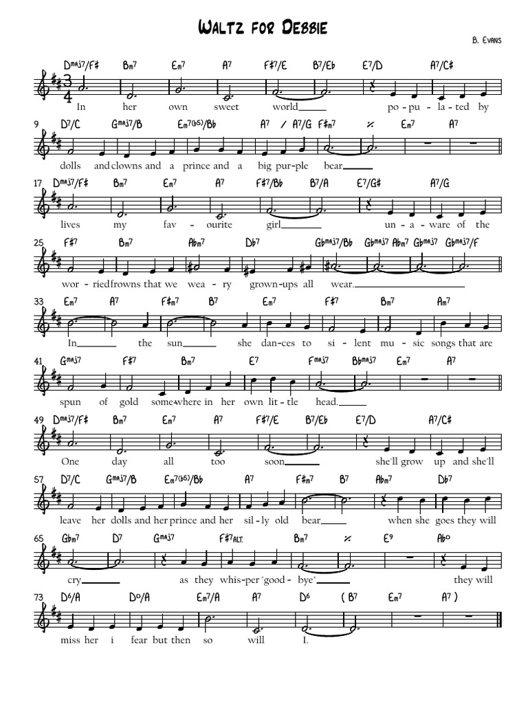 Waltz For Debby By Bill Evans Digital Sheet Music For Individual Part Waltz For Debby Lyrics Populated by dolls and clowns. That we weary grown ups all wear. And a prince and a big purple bear. Somewhere in her own little head. waltz for debby lyrics: waltz for debby lyrics. waltz for debby lyrics. Populated by dolls and clowns. [verse] in her own sweet world. Waltz For Debby Lyrics.