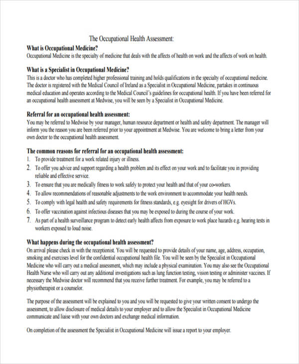 FREE 39+ Health Assessment Form Samples in PDF MS Word Occupational Health Evaluation Employees, union officials, or employers can request an evaluation of possible health hazards at their workplace using this online request form. Identify occupational health hazards, such as biological, chemical, physical, ergonomic and psychological, for all worker groups and industries. When your team spends less time getting care for an injury or completing required assessments, they’re able to focus on their. Occupational Health Evaluation.