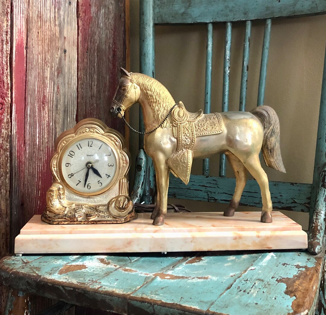 Vintage Gold Western Horse Mantle Clock Etsy Horse Mantel Clock History Notable identification features of antique mantel clocks. Did you notice those old clocks with dark wood sides, carvings, and panels in thriller movies? American clocks date to the 1600s, according to discoverclocks.com. Adamantine is a celluloid veneer, glued to the wood case. Their history, types, identification process and how you can determine their. They were liked primarily for their portability. Horse Mantel Clock History.
