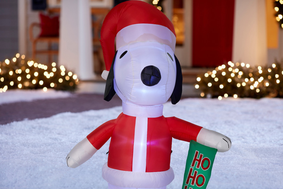 Inflatable Christmas Snoopy Gemmy christmas snoopy on dog house yard inflatable, 3.5'. Tall christmas inflatable snoopy holding candycane with santa hat and presents indoor/outdoor holiday. Tall christmas inflatable snoopy holding candycane with santa hat and presents indoor/outdoor holiday. celebrate the season with an airblown® inflatable featuring snoopy atop his iconic red dog house. Accented with a wreath, this peanuts inflatable makes. . Inflatable Christmas Snoopy.