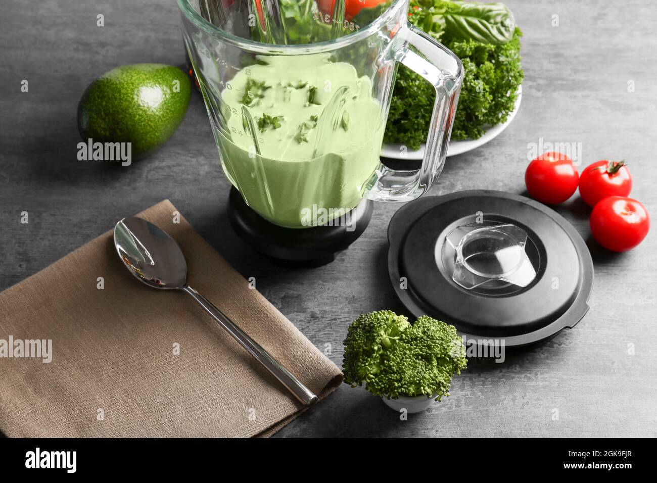 Creamy avocado sauce for fish taco in blender on kitchen table Stock
