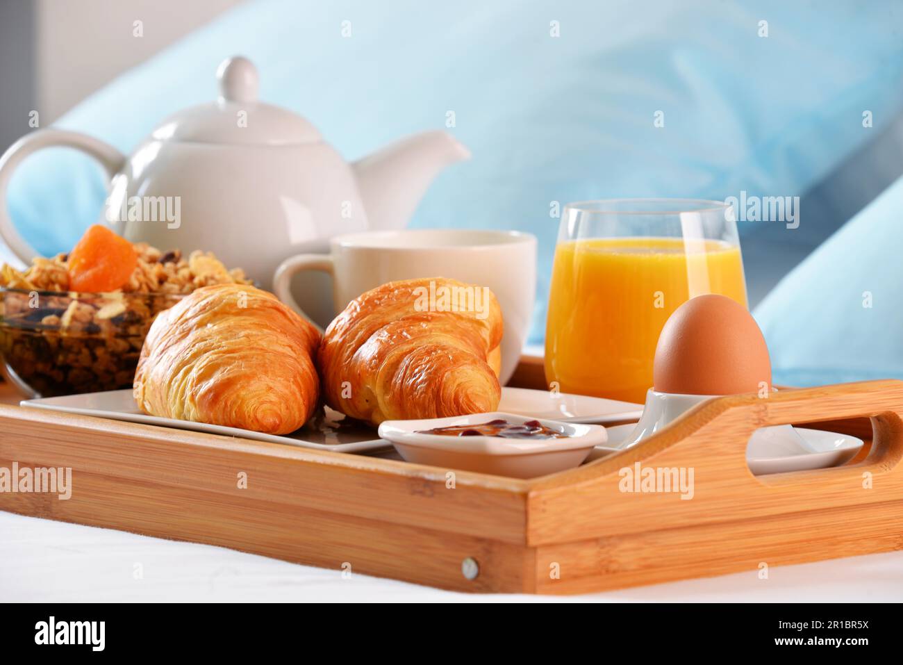Breakfast on tray in bed in hotel room Stock Photo Alamy
