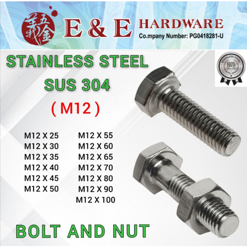 SUS 304 (M12) BOLT AND NUT/SCREW AND NUT/SKRU/BOLT/NUT STAINLESS STEEL