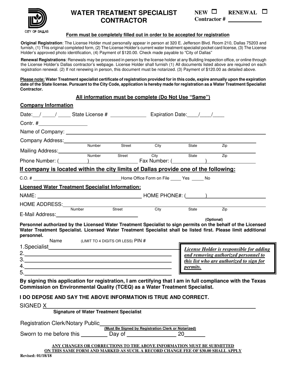 City of Dallas, Texas Water Treatment Specialist Contractor Fill Out