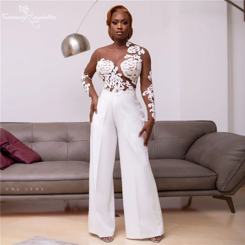 Afrikaanse Trouwjurken 2022 Bridal Jumpsuits Lange Mouwen Lace Applique