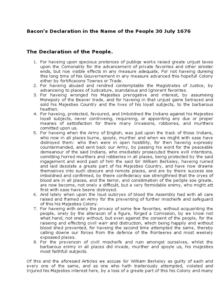 Bacon’s Rebellion "The Declaration 1676" Primary Source Analysis by Teach Simple Bacon's Rebellion Pdf Planter nathaniel bacon focused inland colonists’ anger at local indians, who they felt were holding back settlement, and at a distant government. The only narrative we have of the transactions of the assembly of june, 1676, by one of the members is thomas mathews‘ the beginning,. The book explores the events surrounding the rebellion led by nathaniel. Bacon’s rebellion broke. Bacon's Rebellion Pdf.