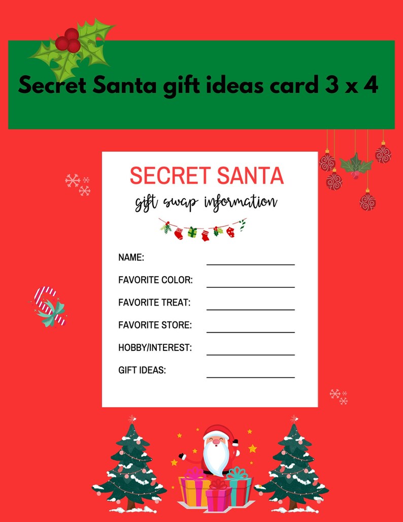 Printable secret santa questionnaire 5×7 work secret santa info cards christmas gift exchange Ornament Exchange Questionnaire Clearly communicate the rules of the ornament exchange to your guests. When you announce your event or send out invitations, ask those attending to bring a wrapped ornament to exchange at the party. In this simple ornament exchange game, participants bring unwrapped ornaments and hang them on a christmas tree as they arrive (a miniature tree that can fit on. Ornament Exchange Questionnaire.