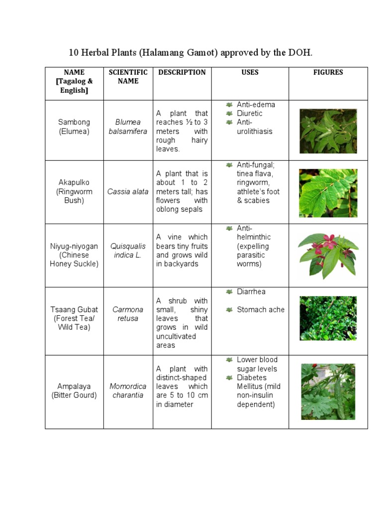 10 Doh Approved Herbal Medicine PDF Clinical Medicine Plants Identify The 10 Herbal Plants Approved By Doh Brainly By encouraging the people in our communities to plant these simple herbal medicines in their backyards, it will be of great aid for them in times of need. Below are the 10 herbal plants recommended for medicinal use by the doh’s traditional medicine program. Study with quizlet and memorize flashcards containing terms like r.a. Study with quizlet and memorize flashcards. Identify The 10 Herbal Plants Approved By Doh Brainly.