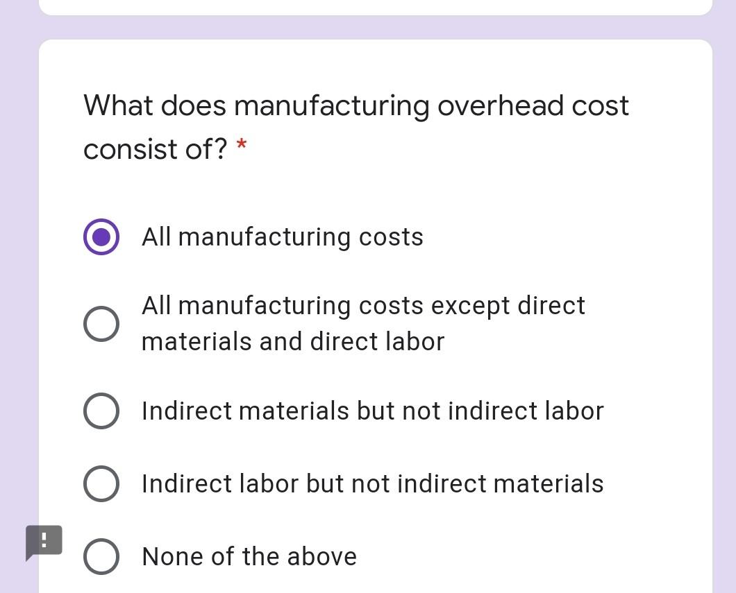 Solved What does manufacturing overhead cost consist of? *