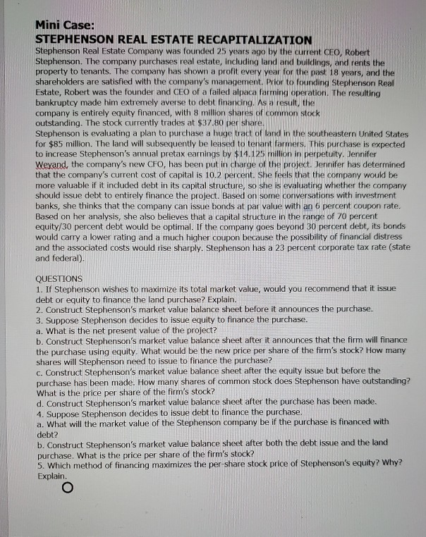 Solved Mini Case STEPHENSON REAL ESTATE RECAPITALIZATION