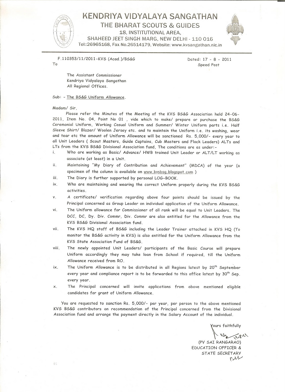 KENDRIYA VIDYALAYA SANGATHAN Bharat Scouts & Guides Uniform Allowance