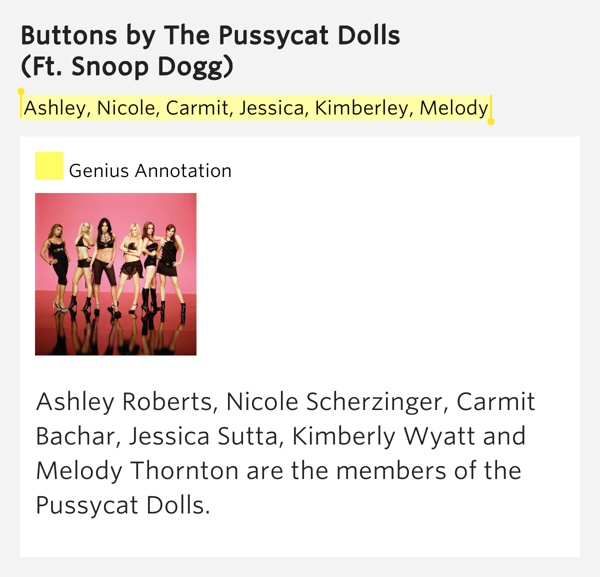 The Pussycat Dolls Buttons Lyrics Genius Lyrics Dolls Buttons Lyrics Yeah, lil' mama, you lookin' good i see you wanna play wit a player. What it do, baby boo? Listen to buttons by the pussycat dolls. Buttons lyrics by pussycat dolls featuring snoop dogg. I'm telling you loosen up my buttons baby (uh huh) but you keep fronting (uh) saying what you goin. I'm telling you loosen up. / yeah,. Dolls Buttons Lyrics.