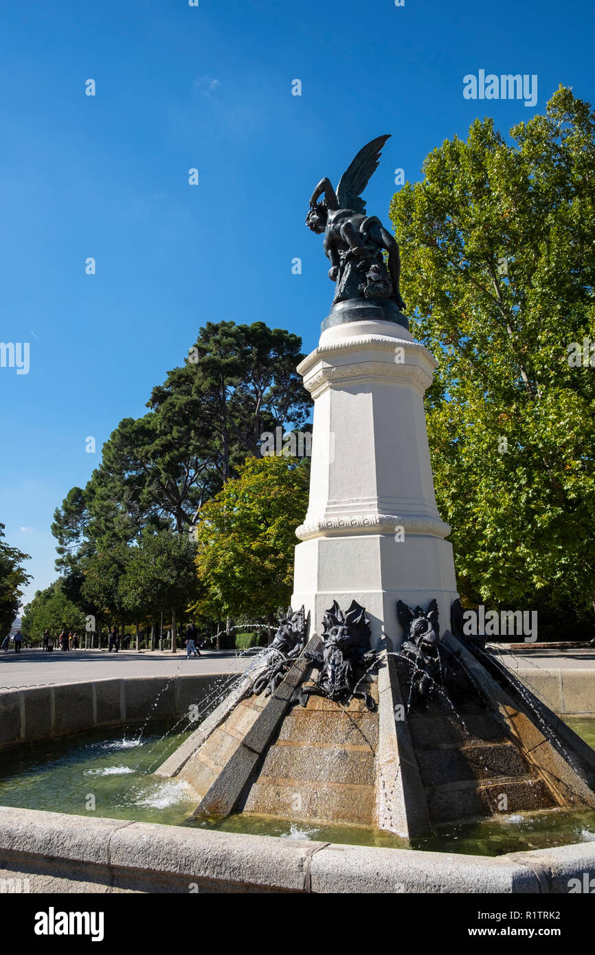 Statue to the Fallen Angel (Angel Caido) in the Retiro park, Madrid Statue Of The Fallen Angel In Madrid In the parque del buen retiro in madrid there is a point where the madrileños stay, the fuente del ángel caído (fountain of the fallen angel). The fallen angel (ángel caído) is set atop a marble pillar in the midst of a fountain decorated with sinister demonic entities and. There is a copy of this statue at the san fernando.. Statue Of The Fallen Angel In Madrid.