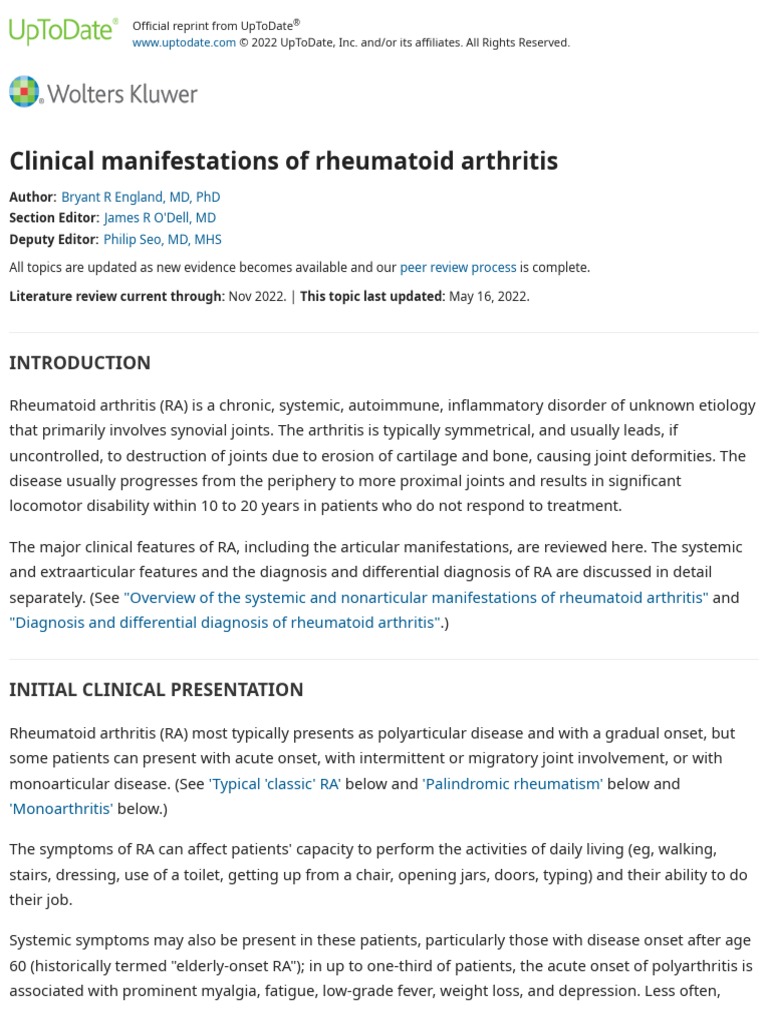 Clinical Manifestations of Rheumatoid Arthritis UpToDate PDF