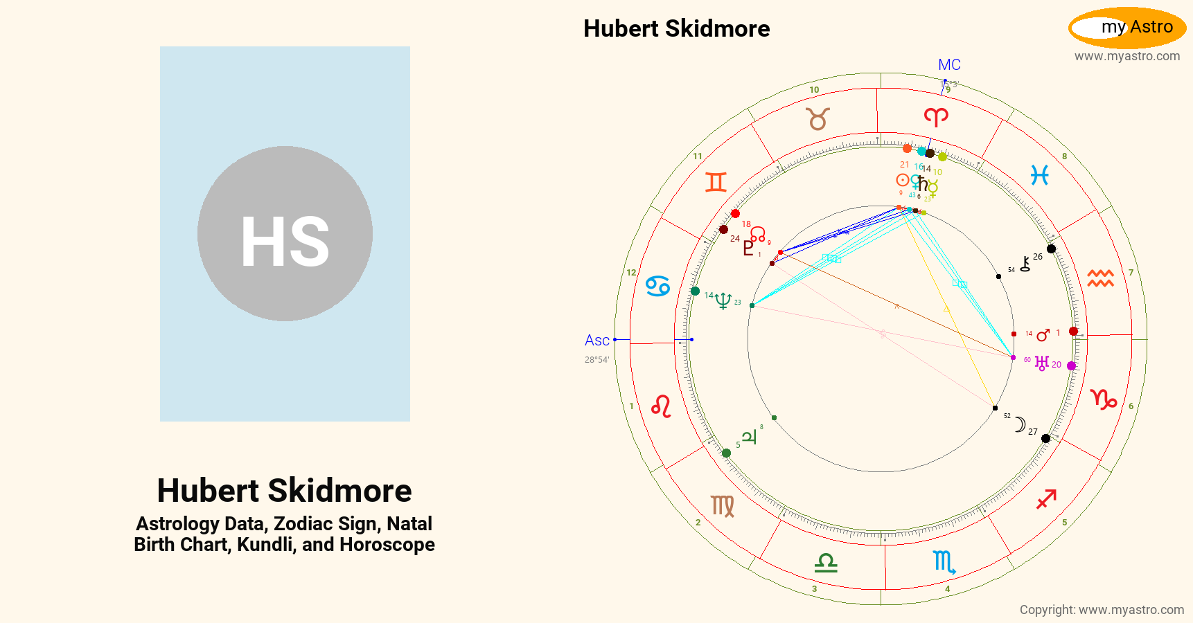 Hubert Skidmore’s natal birth chart, kundli, horoscope, astrology