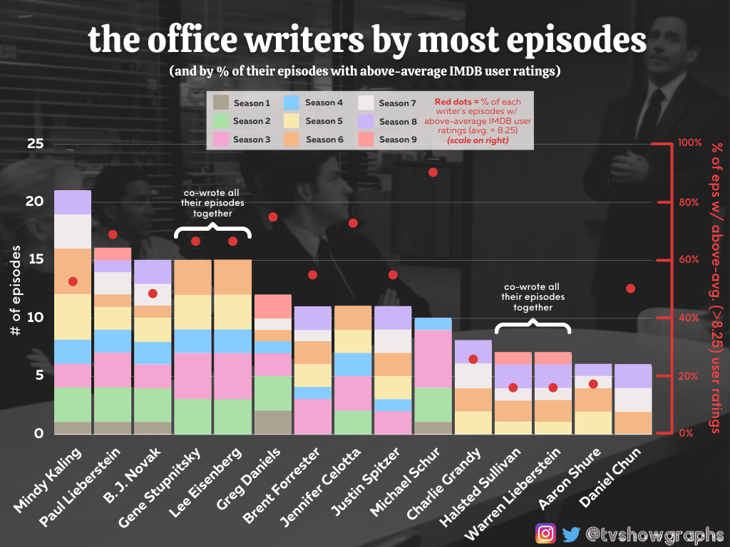 [OC] 'The Office' (US) writers by of episodes & of episodes they wrote with aboveaverage
