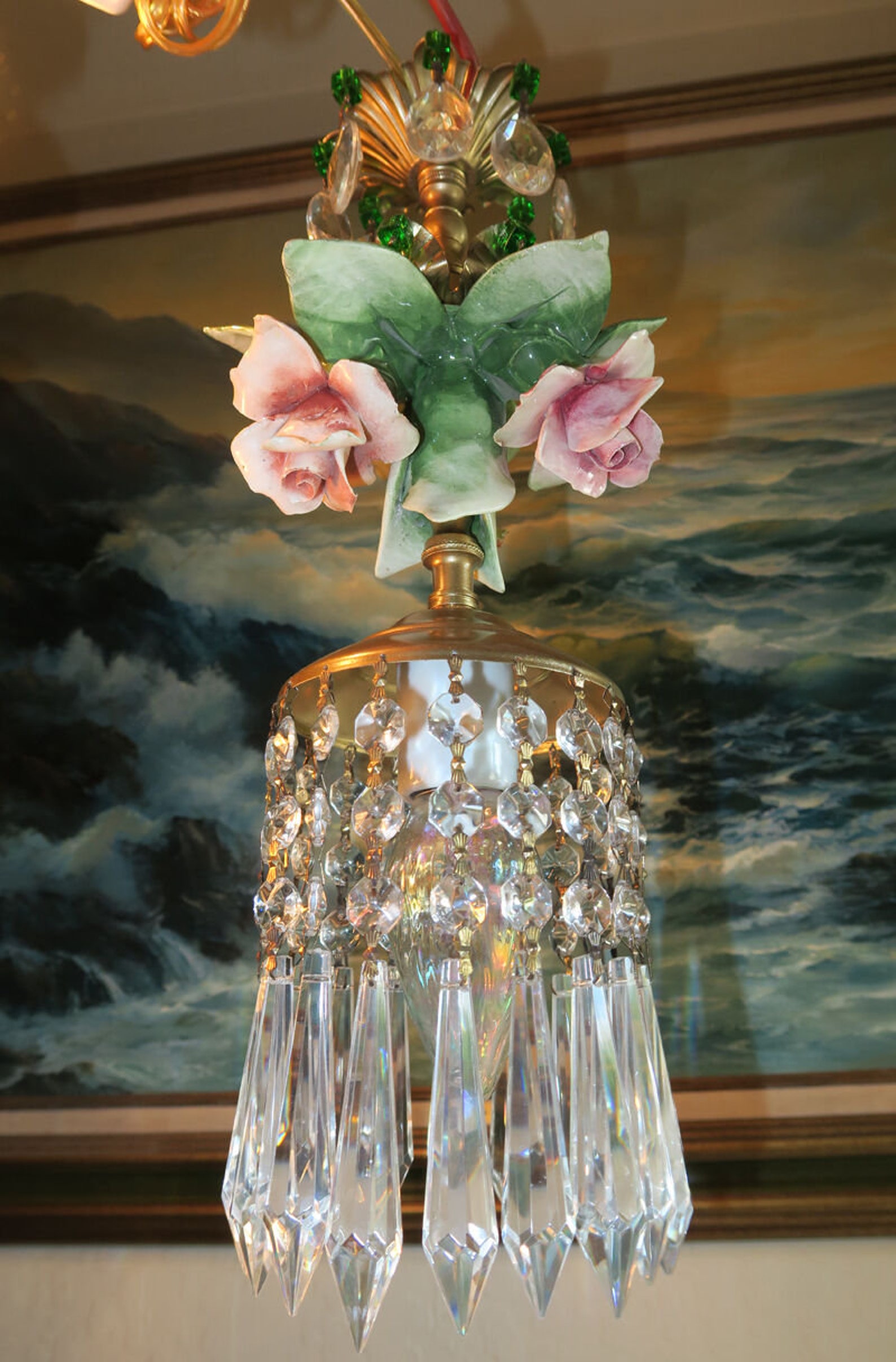 1 Porcelain Capodimonte Pink Shabby Rose Brass Tole Chandelier Etsy