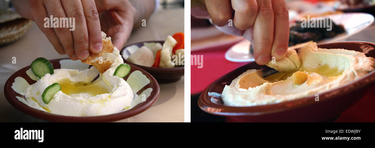 Collage of a man dipping a pita bread slice in traditional hummus and