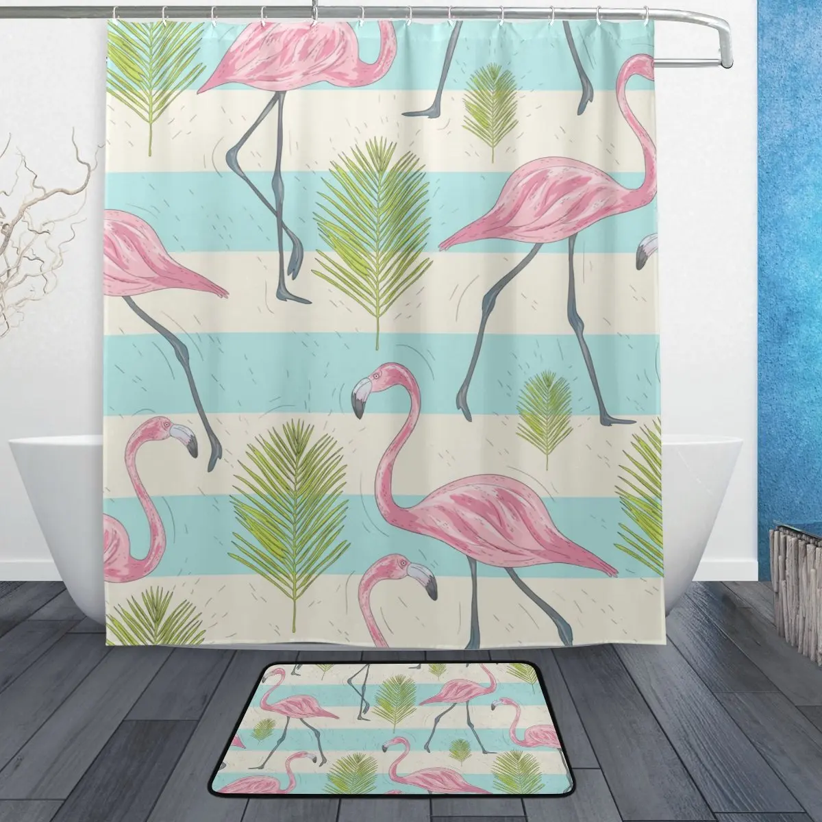 Pink Flamingos Palm Leaf Shower Curtain Polyester Fabric Bathroom