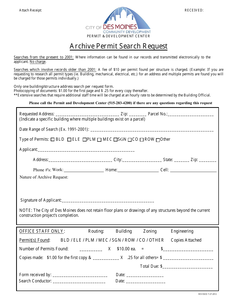 City of Des Moines, Iowa Archive Permit Search Request Fill Out, Sign Online and Download PDF
