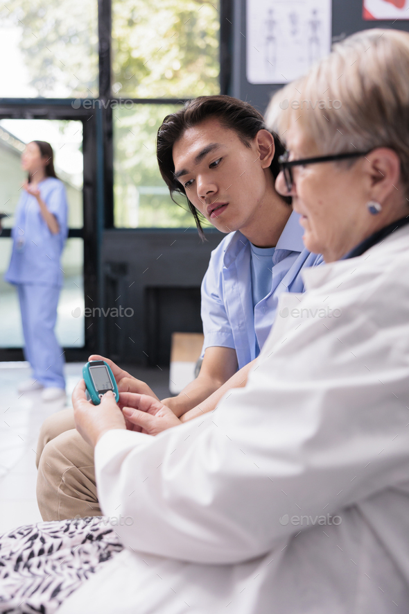 Senior physician medic measuring insulin level and glucose in blood