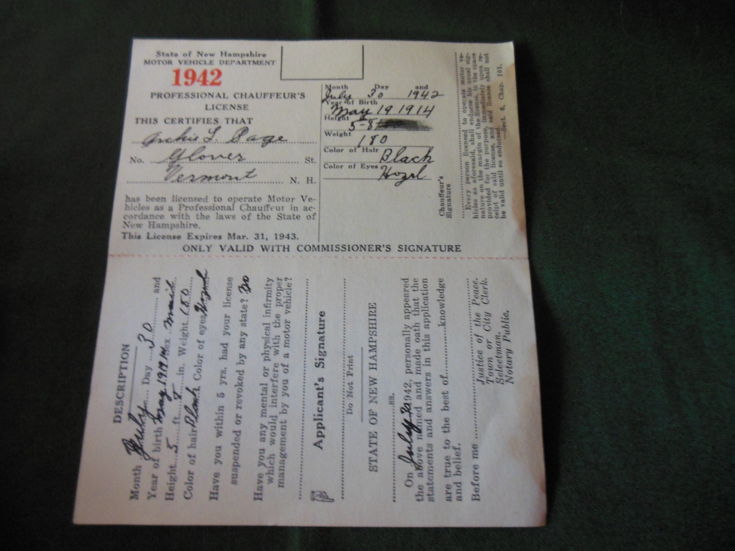Original Copy of 1942 Driver's License Glover Vermont
